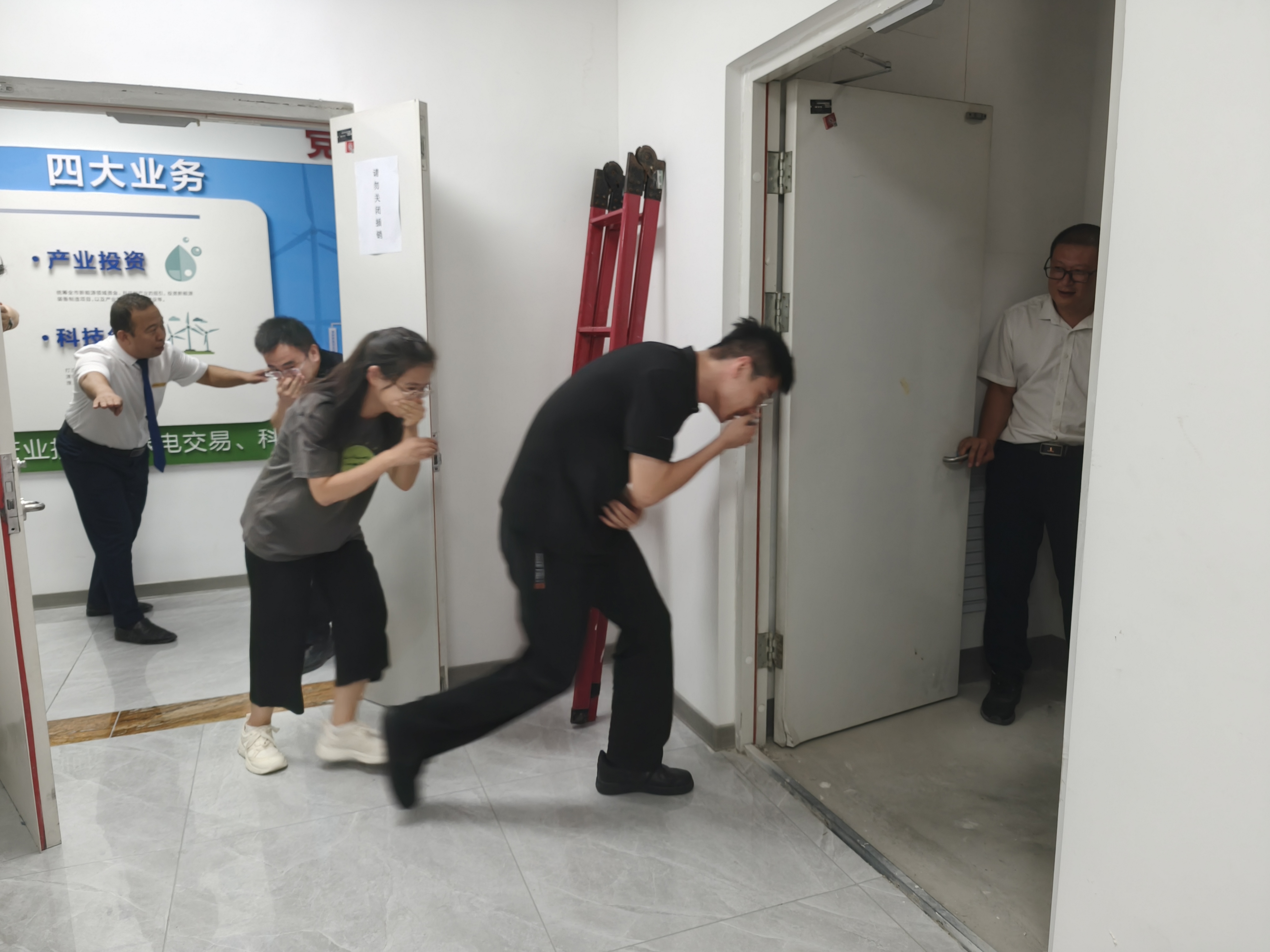 在之后的逃生疏散演练环节,伴随铃声响起,参与人员严格按照教官所讲的方法,捂住口鼻,低头弯腰,紧张而有序地从预定路线撤离,快速到达室外指定集合点。